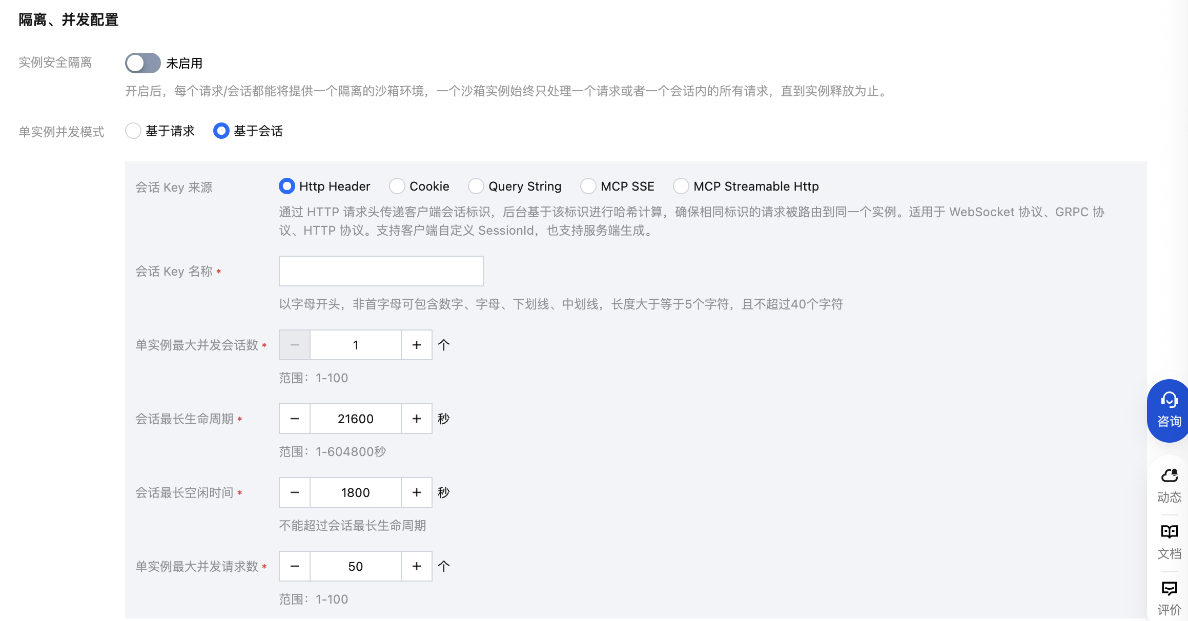 会话 Key 来源 | 用于说明从哪里获取客户端标识,系统根据此标记来决定要调度到同个实例上。可选项:Http Header、Cookie、Query String、MCP SSE、MCP Streamable HTTP,五选一。不同选项支持场景说明如下: Http Header 通过 HTTP 请求头传递客户端会话标识,后台确保相同标识的请求被路由到同一个实例。适用于 WebSocket 协议、gRPC 协议、HTTP 协议。支持客户端自定义会话 ID(SessionId) ,也支持服务端生成。 Cookie 将携带相同 Cookie 信息的请求路由到同一个实例。支持客户端生成会话 ID(SessionId) ,也支持服务端生成。 Query String 客户端在 QueryString 中自定义会话 ID,相同会话 ID(SessionId) 的请求路由到同一个实例。 MCP SSE 基于 MCP SSE 协议规范,确保客户端携带相同会话 ID(SessionId) 的请求始终路由到同一个实例。 MCP Streamable HTTP 基于 MCP HTTP 协议规范,确保客户端携带相同会话 ID(SessionId) 的请求始终路由到同一个实例。 | Http Header |