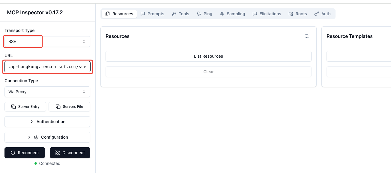 https://******.ap-****.tencentscf.com/sse。如果 Transport Type 为 Streamable HTTP,URL 为