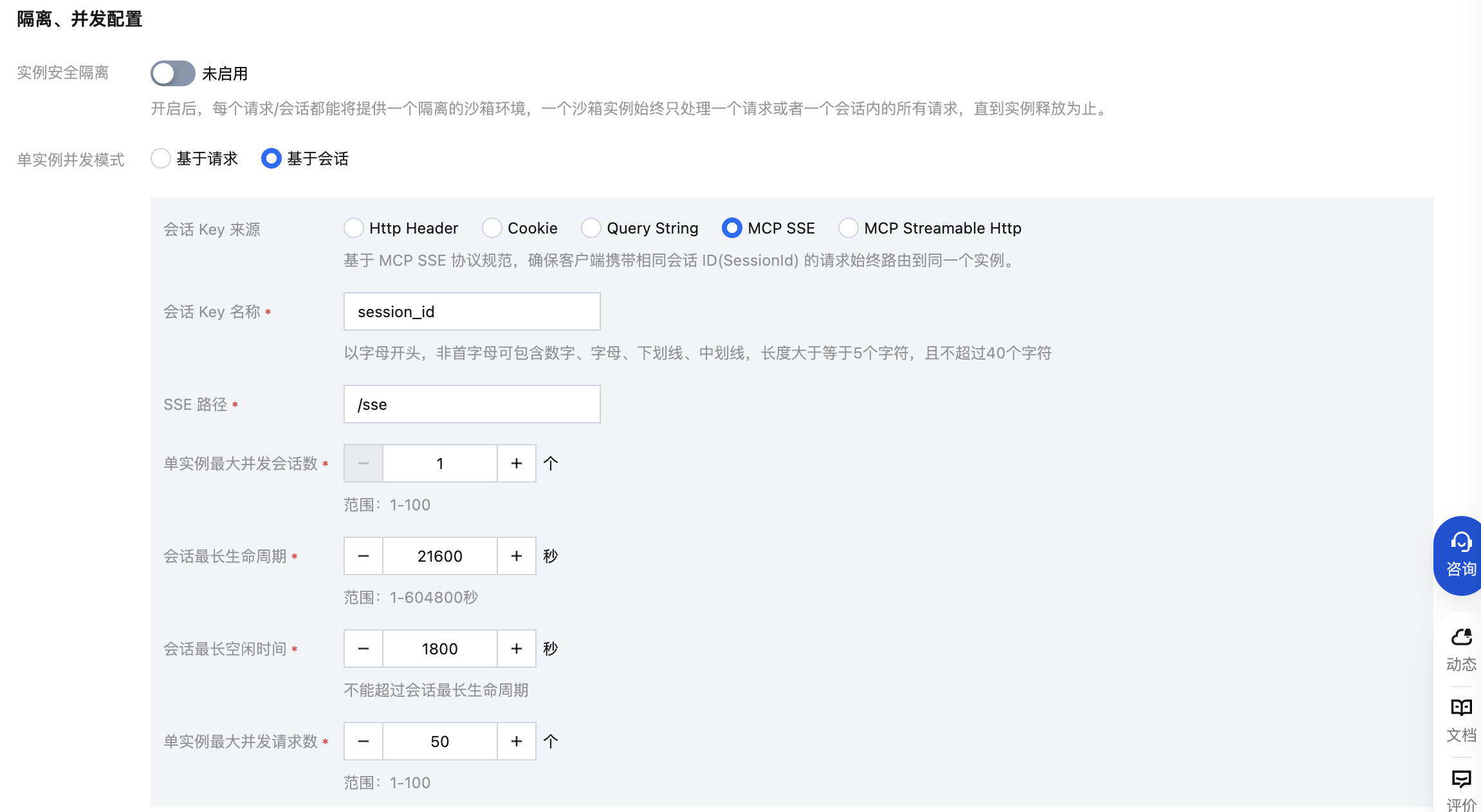 SSE 路径 | 如果会话 Key 来源选择 MCP SSE,需要填写发起 SSE 连接请求的路径。 ![]() | 默认 /sse ,支持修改 |
