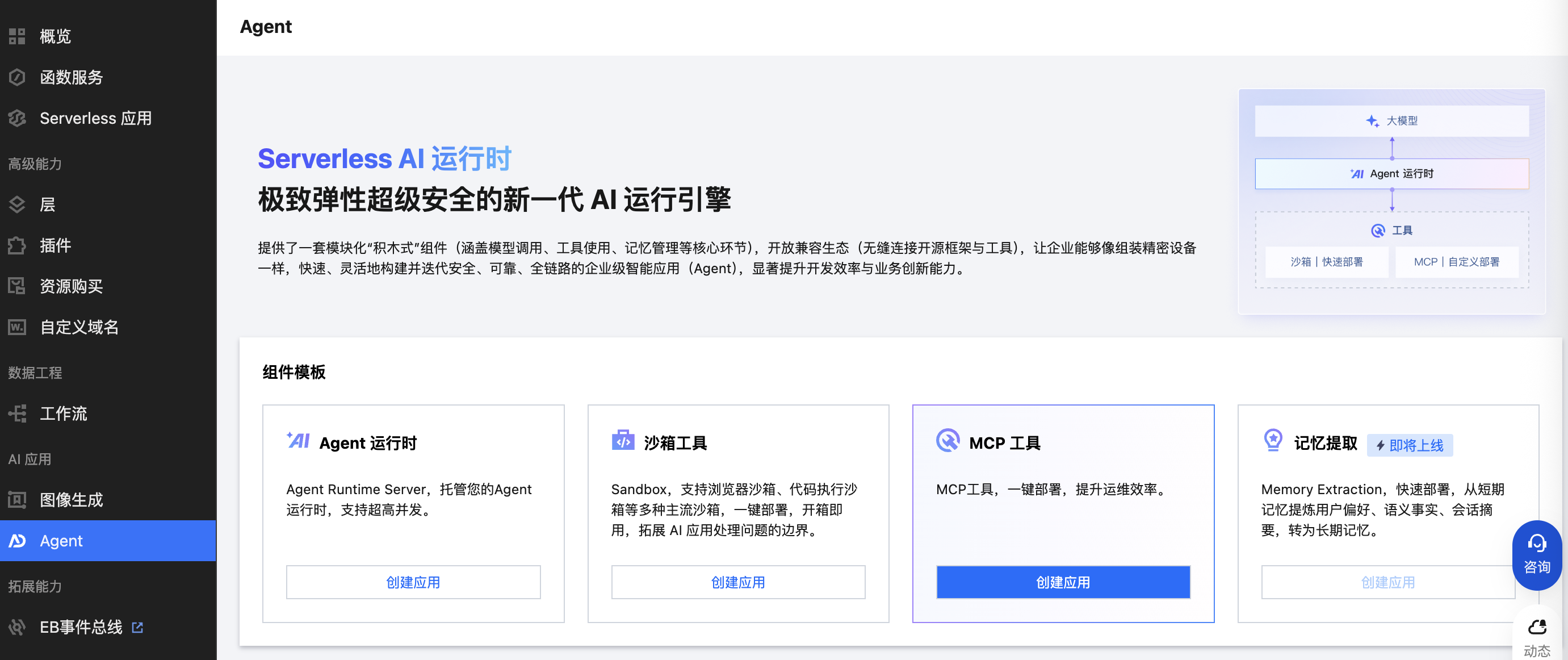 2. 在 Serverless AI 运行时页面上的 MCP 工具区域,单击创建应用,进入应用创建流程。