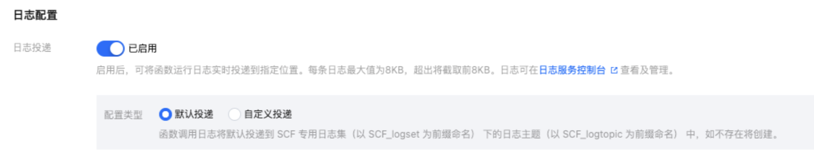 6. 在日志配置板块:启用日志投递,可将函数运行日志实时投递到指定位置。详情请参见 日志投递配置。