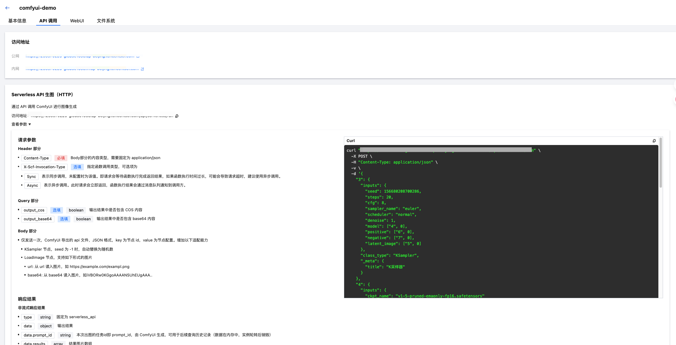 Body 部分 | - | - | - | 仅发送一次,ComfyUI 导出的 API 文件,JSON 格式,key 为节点 id,value 为节点配置。 增加以下适配能力: KSampler 节点,seed 为 -1 时,自动替换为随机数。 LoadImage 节点,支持如下形式的图片: url:从 url 读入图片,如 https://example.com/example.png。cos:从 cos 读入图片(需要为函数授予相关权限),如 cos:https/1253970226-e2sef2gdnt.ap-chongqing.tencentscf.com/example.png。base64:从 base64 读入图片,如 iVBORw0KGgoAAAANSUhEUgAAA...。 |