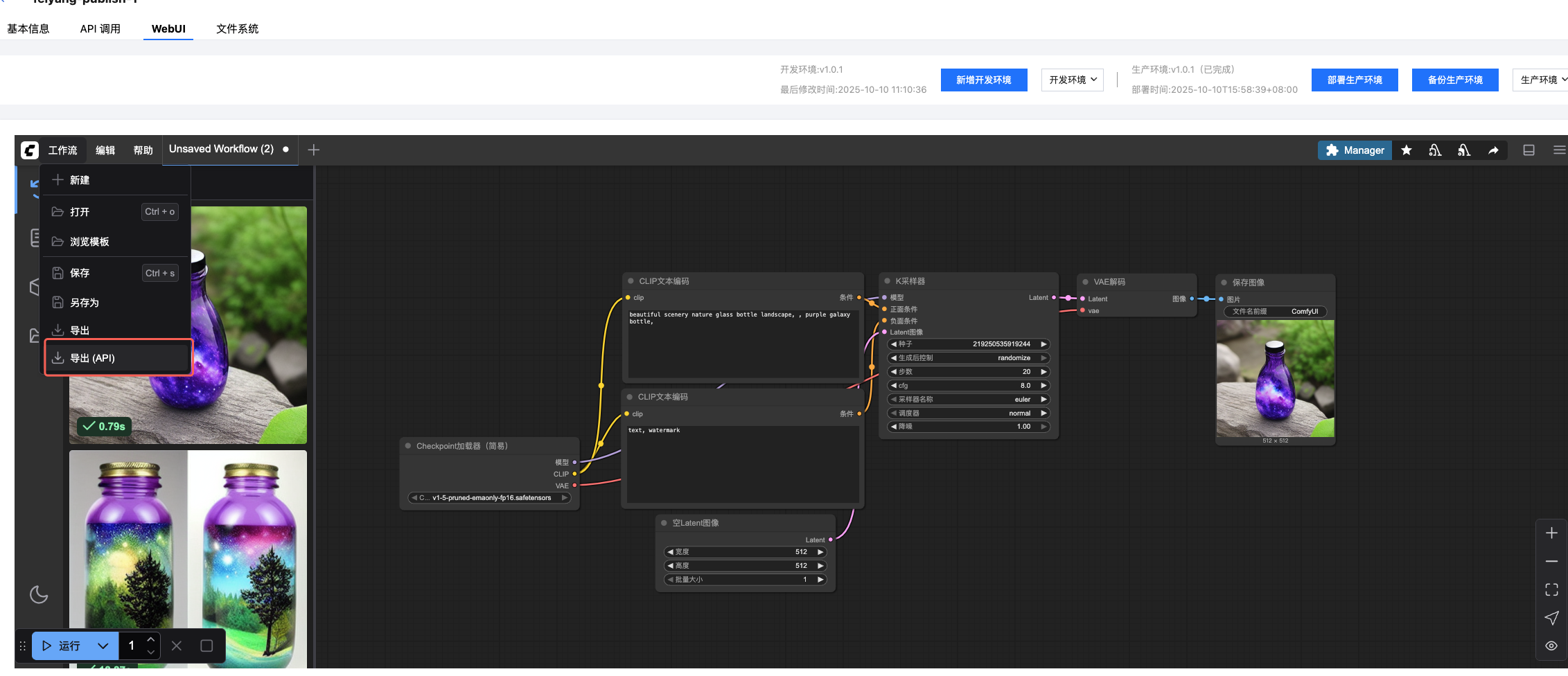 1. 在进行 API 调用之前,请先在 ComfyUI WebUI 中搭建并调试您所需的工作流,并确认该工作流可以成功生成图像。