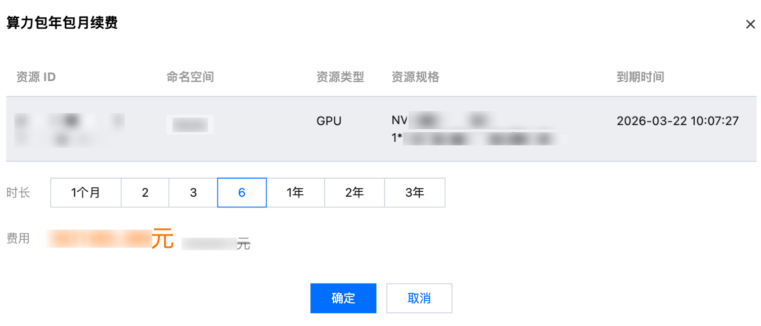 3. 在算力包年包月续费页面,选择续费时长。
