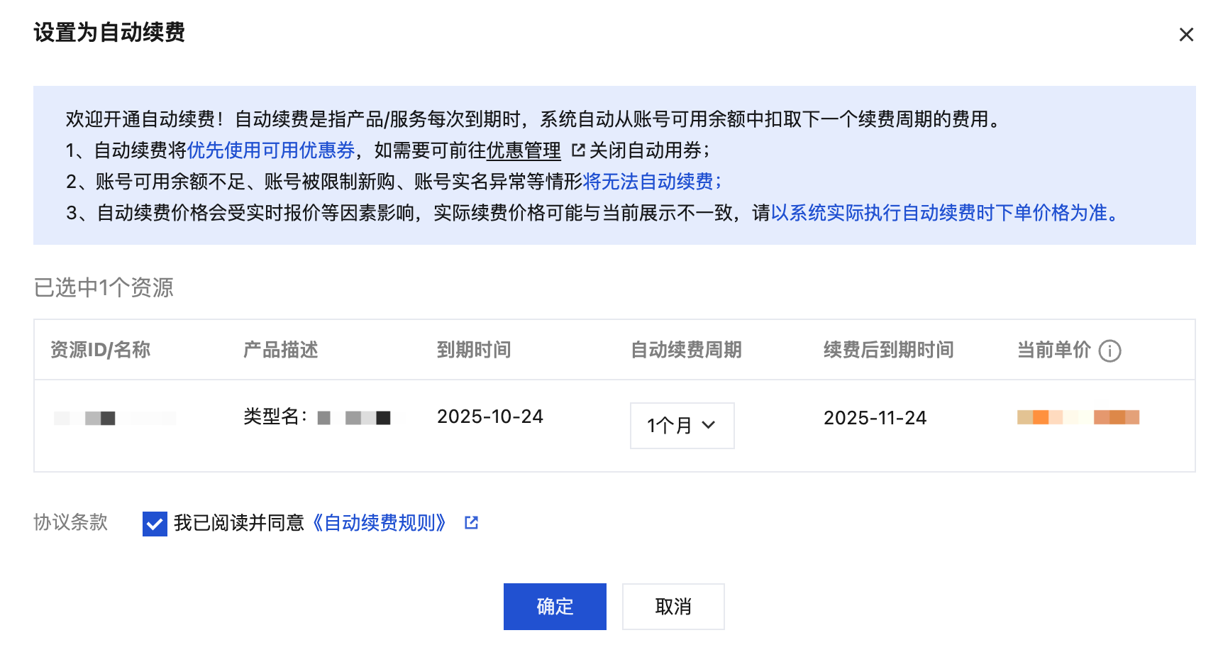 4. 在设置为自动续费页面,确认资源信息,勾选同意协议条款。