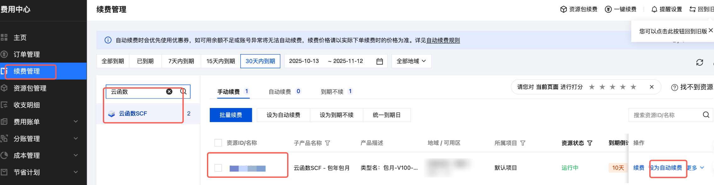 3. 在费用中心 > 续费管理,筛选“云函数”,勾选资源 ID/名称,并单击右侧的设为自动续费。