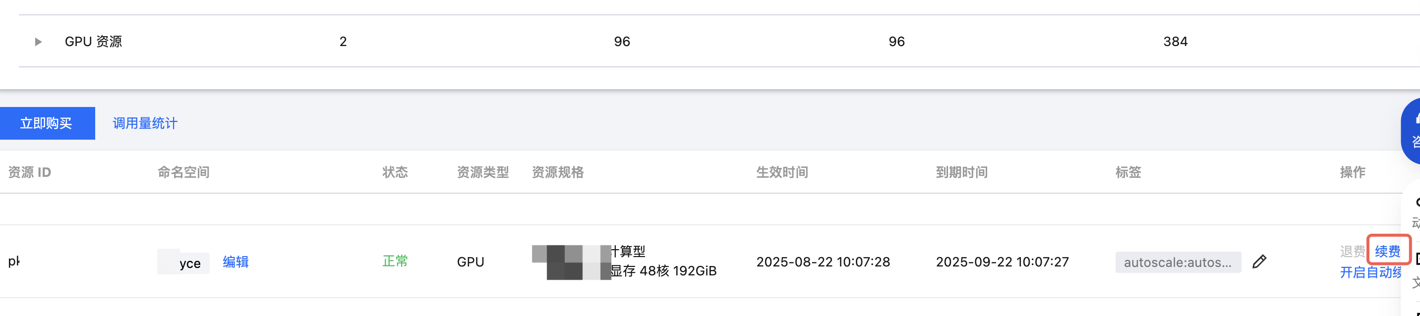 2. 在资源列表中,单击右侧的操作 > 续费。