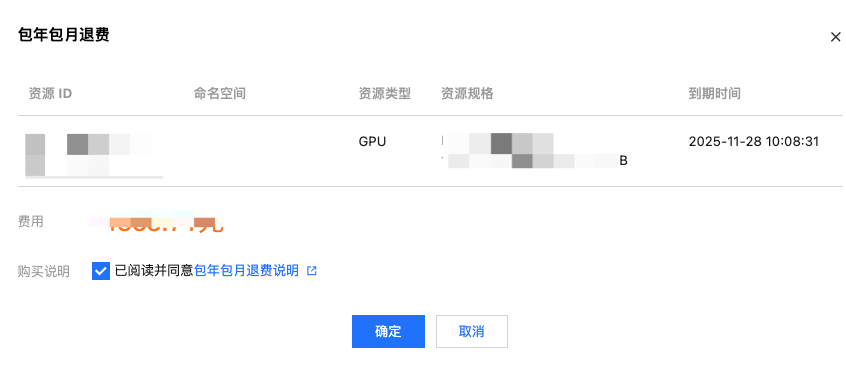 2. 在包年包月退费页面,确认退费信息无误后,勾选已阅读并同意包年包月退费说明,并单击确定。如下图所示: