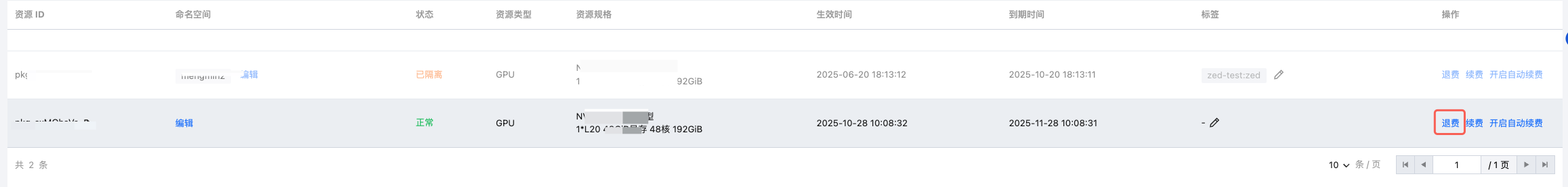 1. 在资源列表页操作列选择退费。如下图所示: