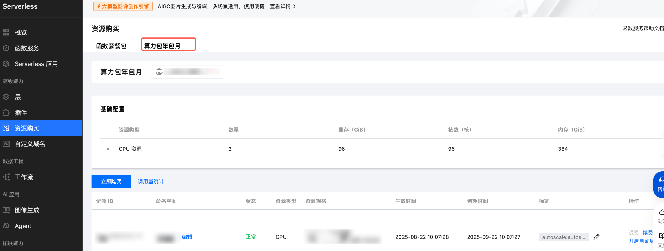 1. 在资源购买中,选择算力包年包月页签。
