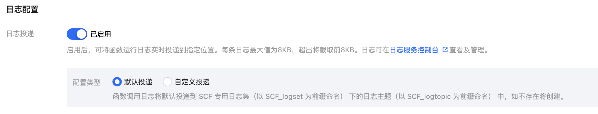 5. 在日志配置版块:默认启用日志投递,可将函数运行日志实时投递到指定位置。详情请参见 日志投递配置。