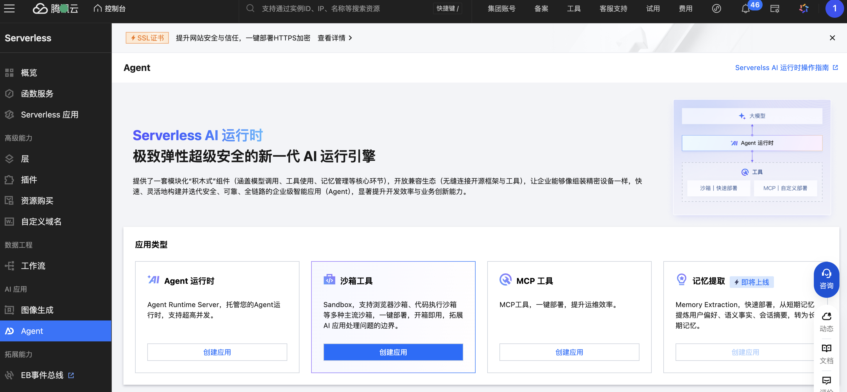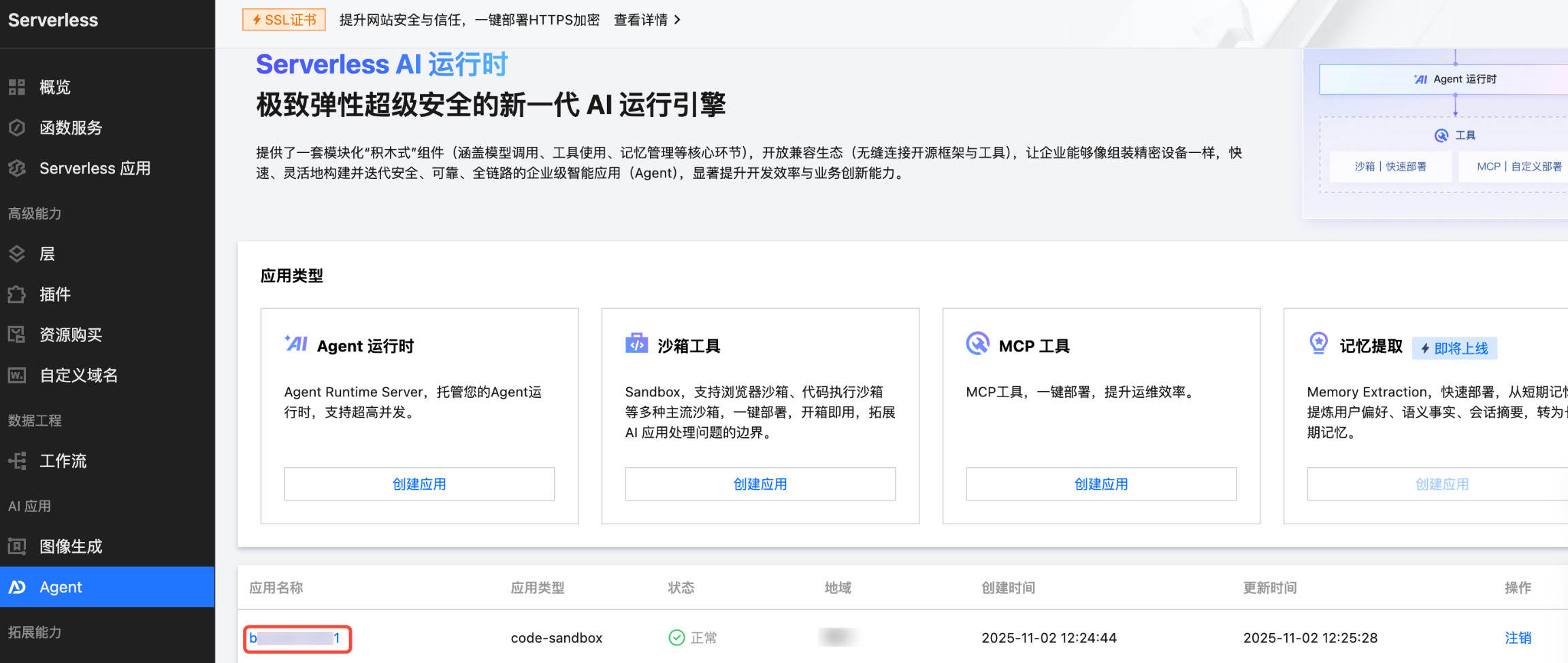 2. 在 Serverless AI 运行时页面上的沙箱工具区域,单击创建应用,进入应用创建流程。