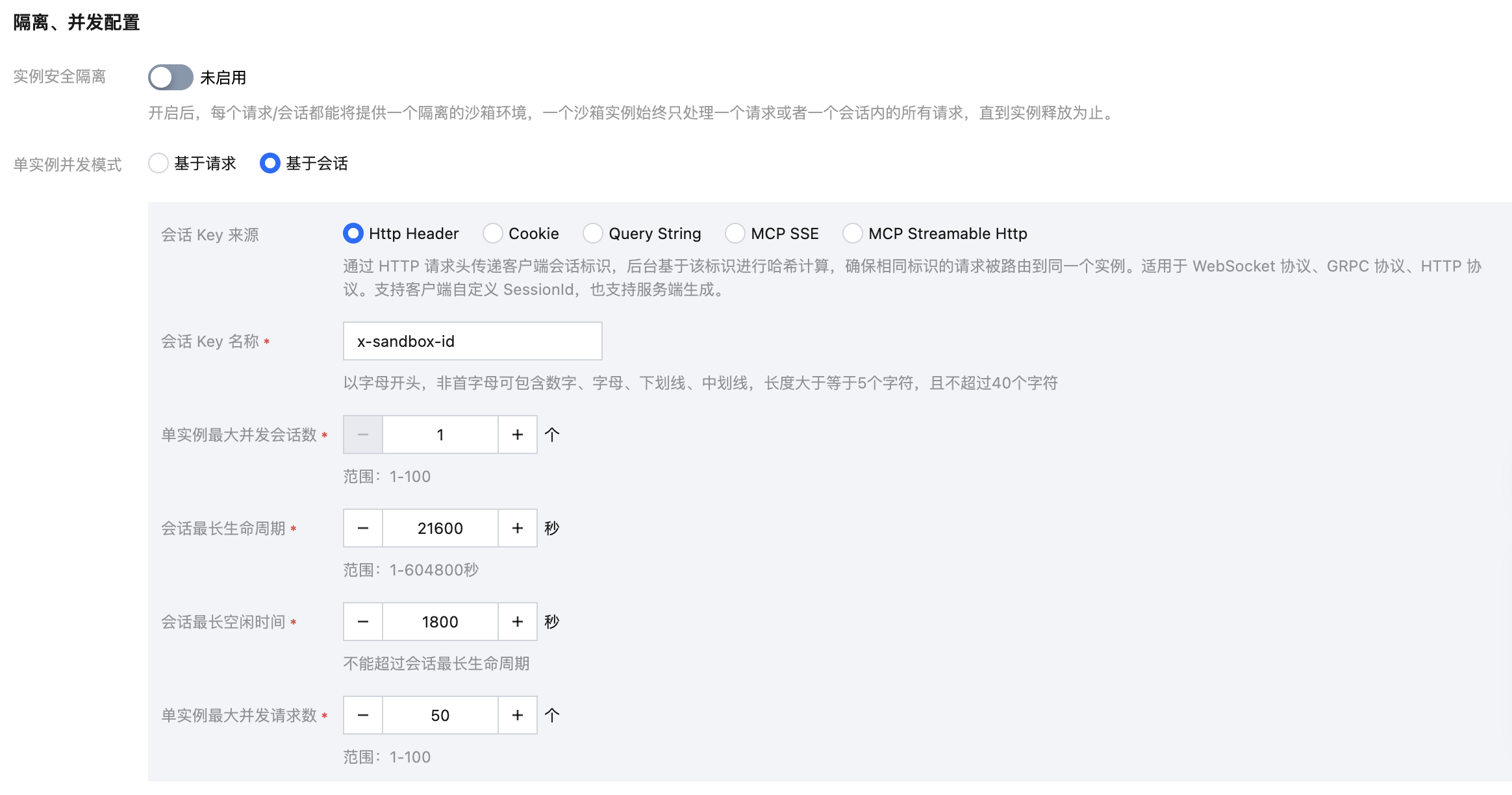 配置基于会话单实例并发模式,该配置主要用于标记客户端请求以哪种方式携带沙箱 ID、配置沙箱生命周期、底层实例支持的沙箱并发数和请求,其中本应用中“会话”的配置对应的是“沙箱”的配置。具体配置项说明如下: