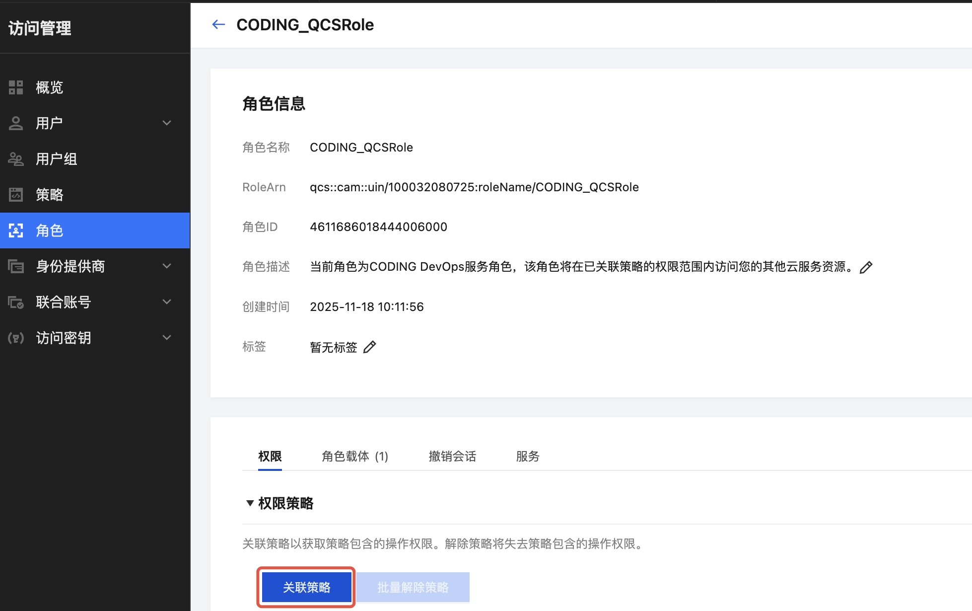 1.2 进入访问管理 > 角色控制台,单击对应的角色名称 CODING_QCSRole。