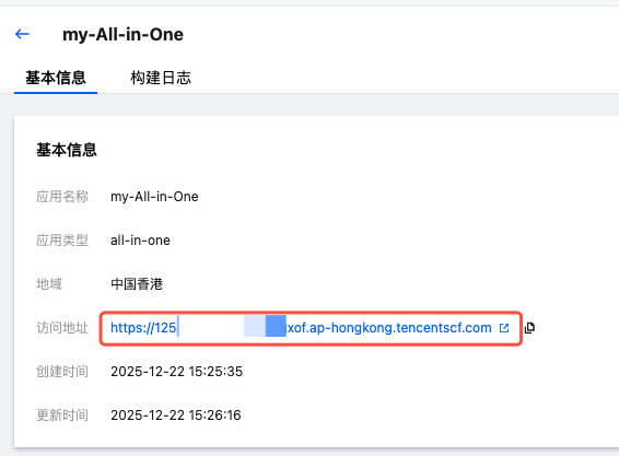 应用部署完成后,单击应用名称,进入应用详情页面,即可获取应用访问地址。