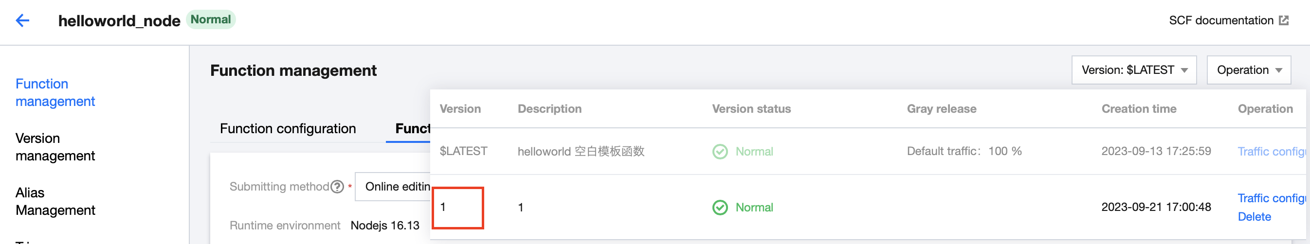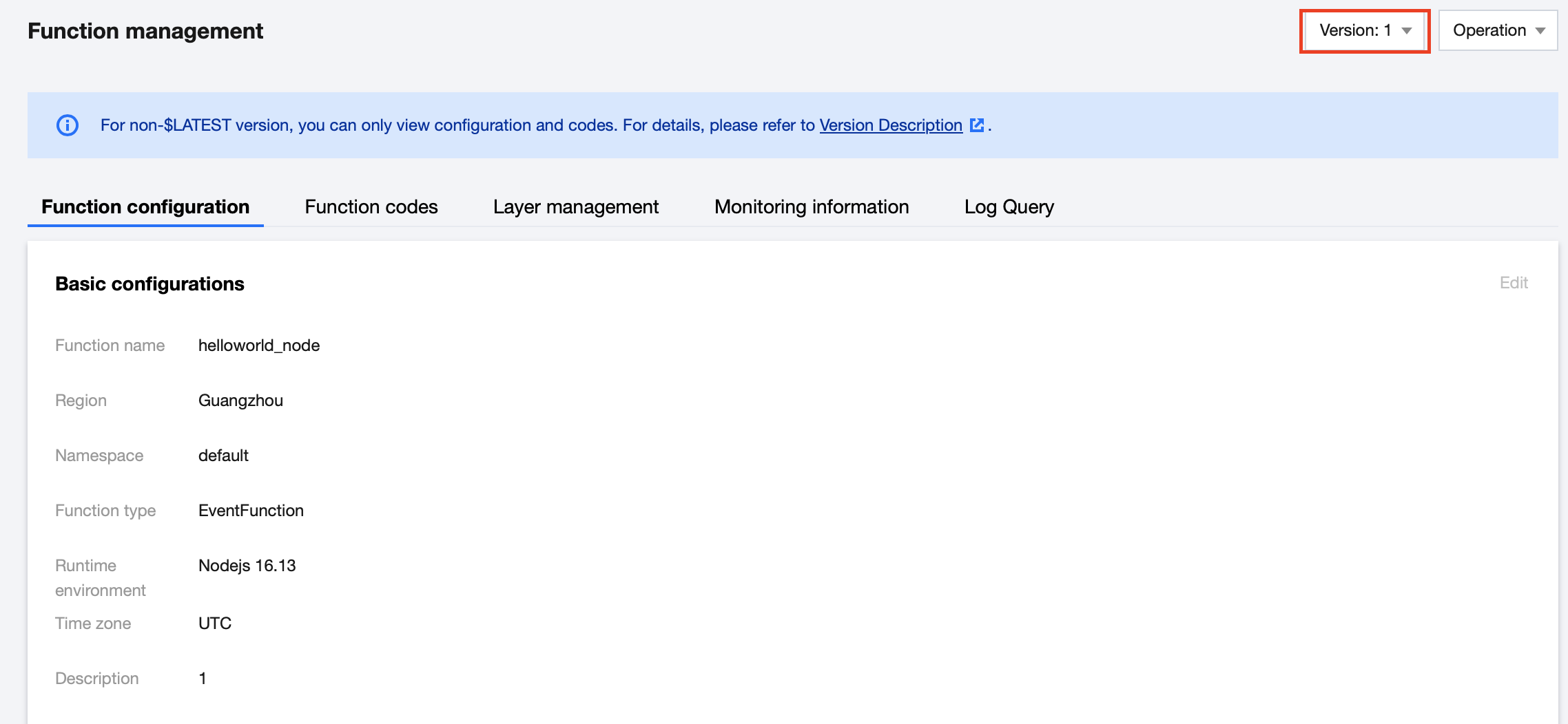 4. Select the "Version" dropdown list in the upper right corner of the function details page, and click on the name of the version you want to view. This document uses version 1 as an example, as shown below: