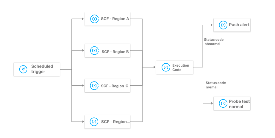 By deploying multi-regional function dial-tests on the same URL, we can achieve high-availability performance dial-testing tasks. The related architectural diagram is as follows: