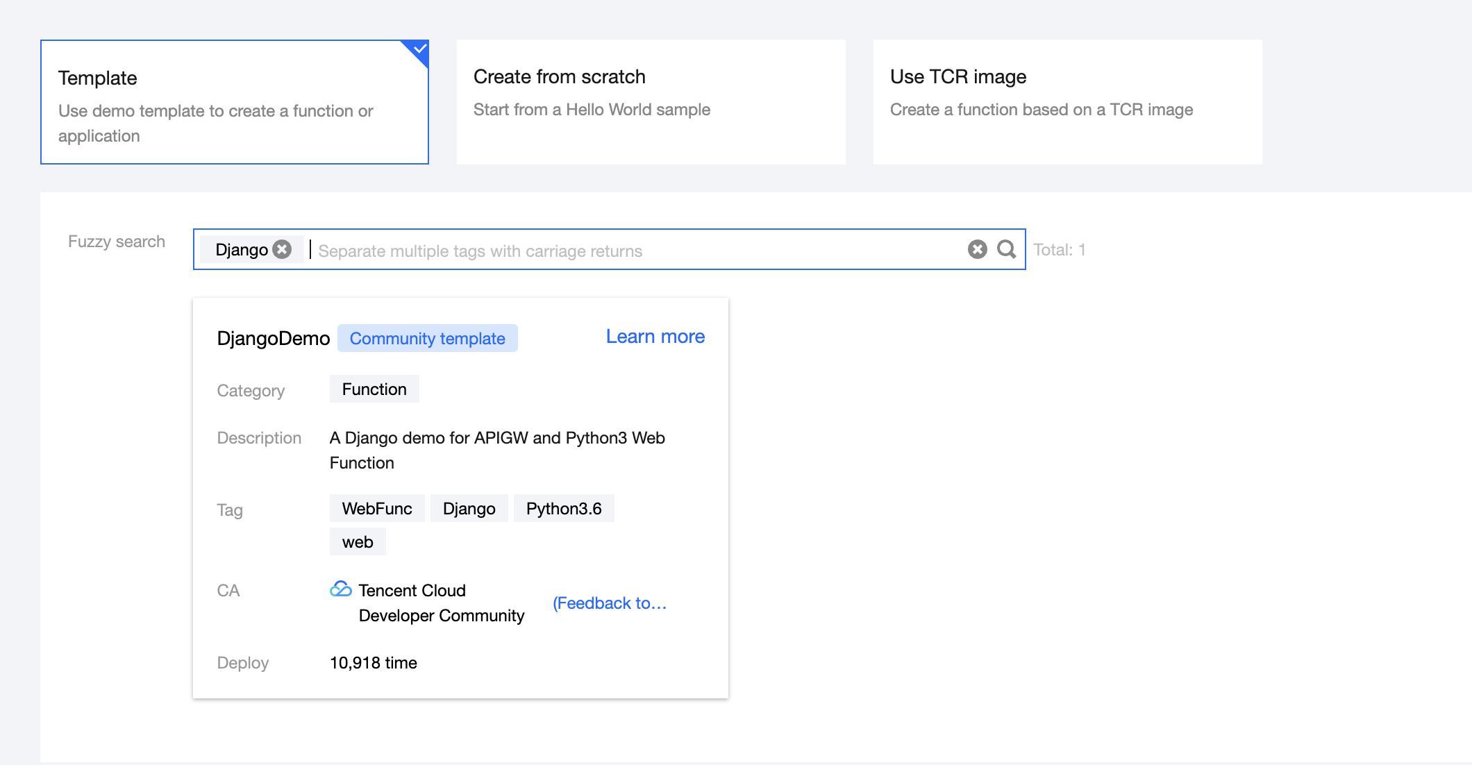 3. Choose to create a new function using Template Creation. In the search box, enter Django, select the Django Framework Template, and click Next. As shown in the figure below: