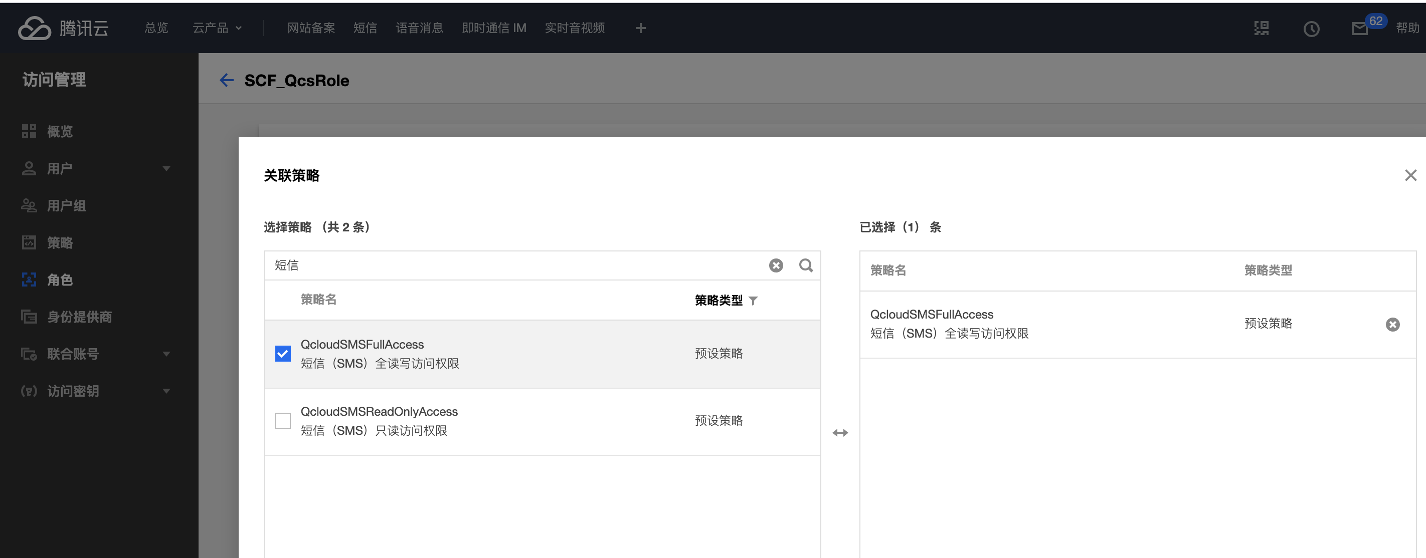 需要在 访问管理 控制台给 SCF_QcsRole 角色添加短信 QcloudSMSFullAccess 权限。