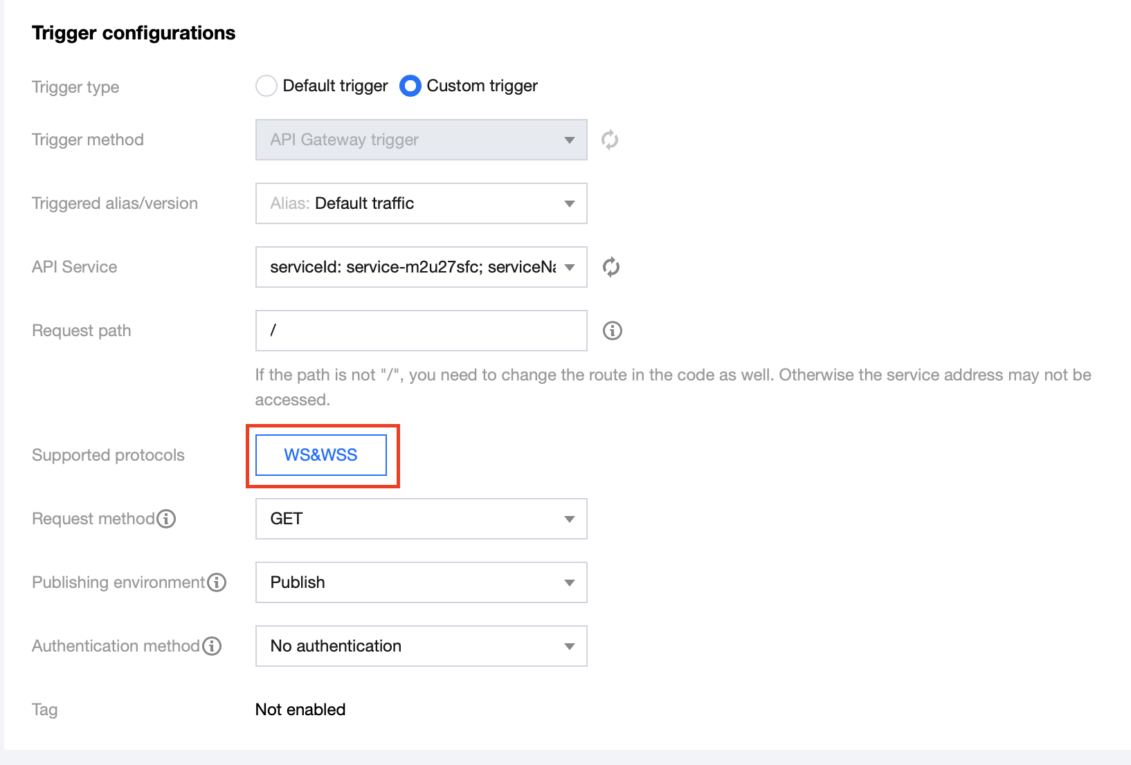 5. After enabling WebSocket support, in Trigger configurations, the protocol support of the API Gateway will also automatically switch to WS&WSS support. The link address provided by the created API Gateway will also be a WebSocket address. As shown below: