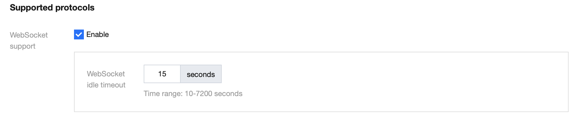 After creation, the support for WebSocket protocol cannot be canceled, but the idle timeout period can be changed as needed.