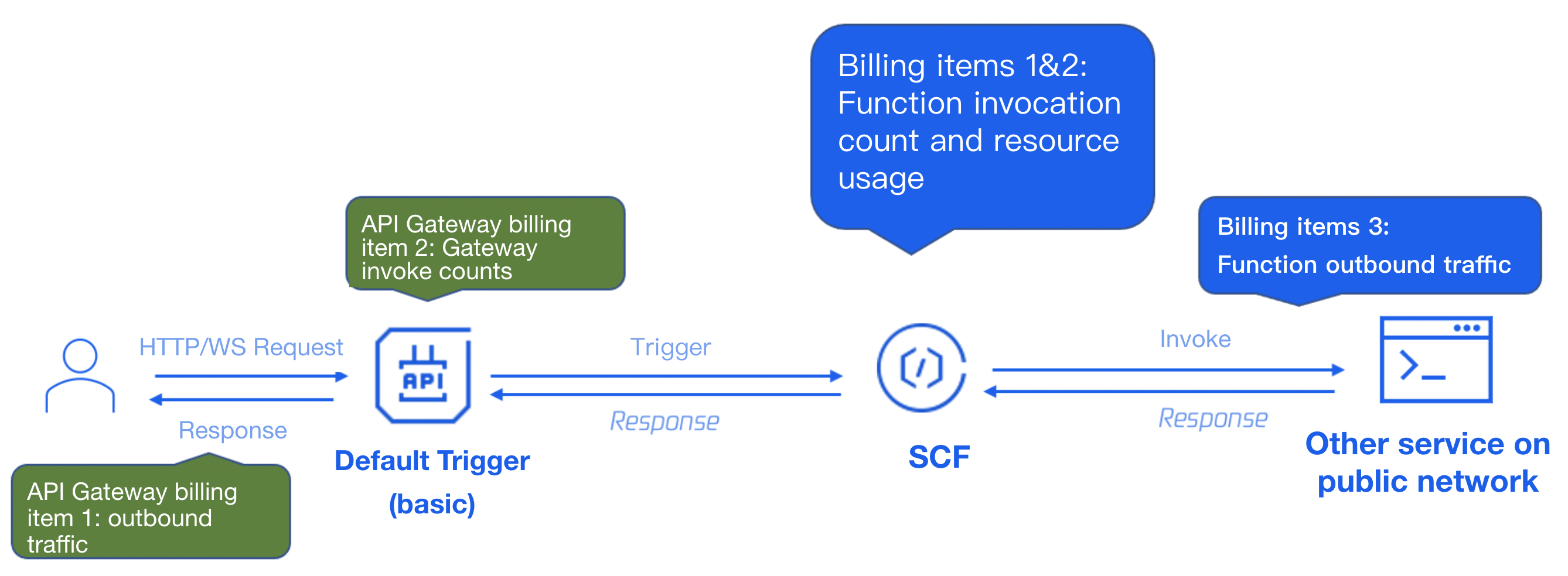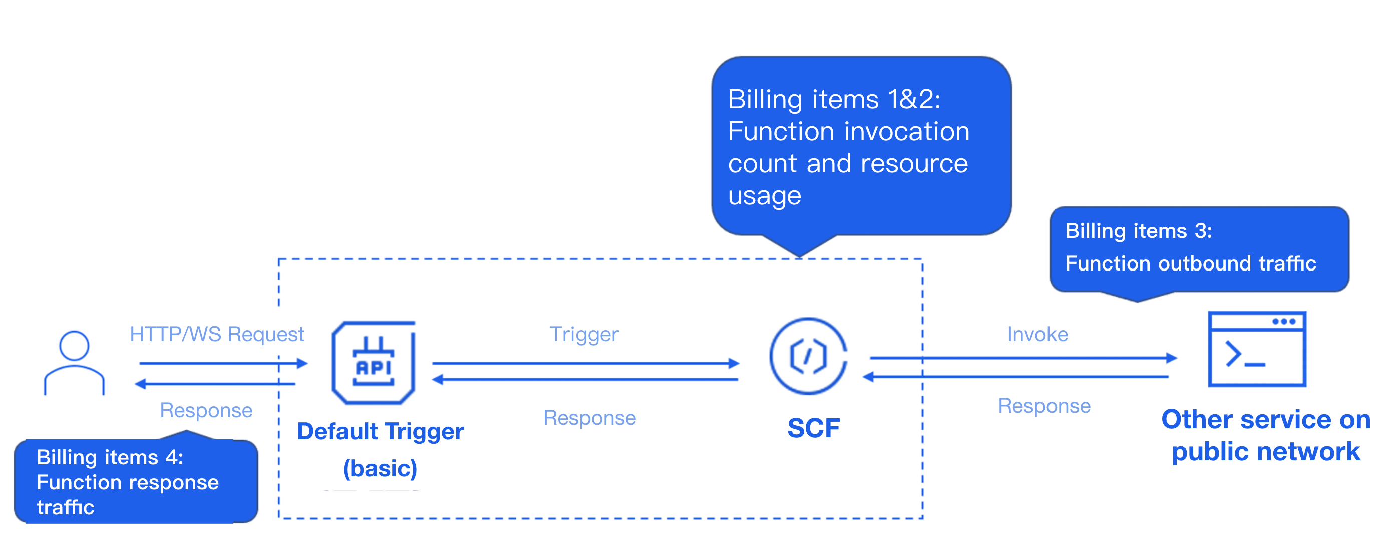 Function side: Costs are calculated based on standard billing items (number of calls, resource usage, outbound traffic). Response traffic is not included in the function side calculation.