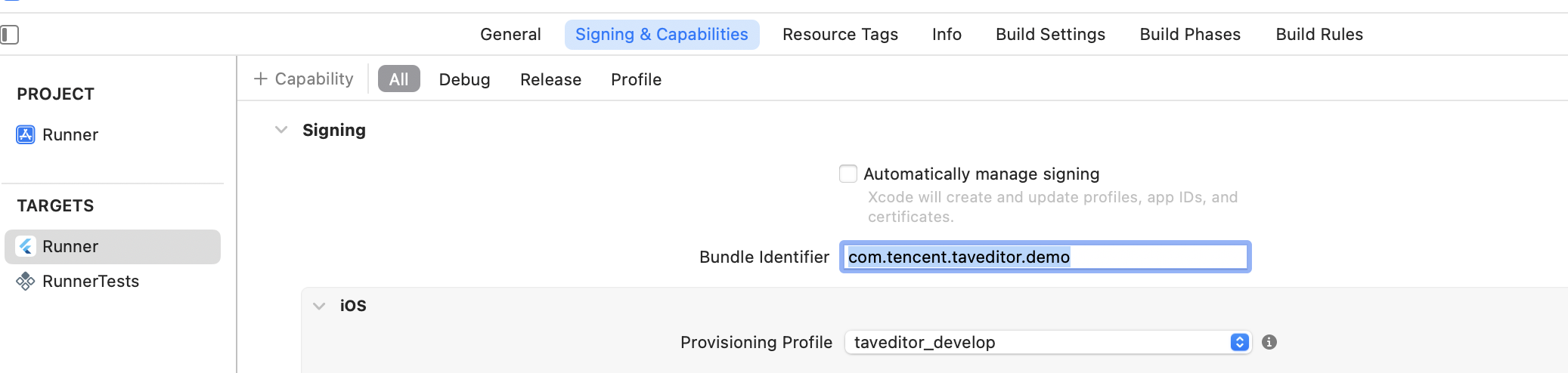 example/ios 文件夹下,打开 Runner.xcworkspace 进入 Xcode 管理项目。打开后,在 Runner Target 下的 Signing & Capabilities 标签下,替换为您 License 和开发签名对应的包名和描述文件。