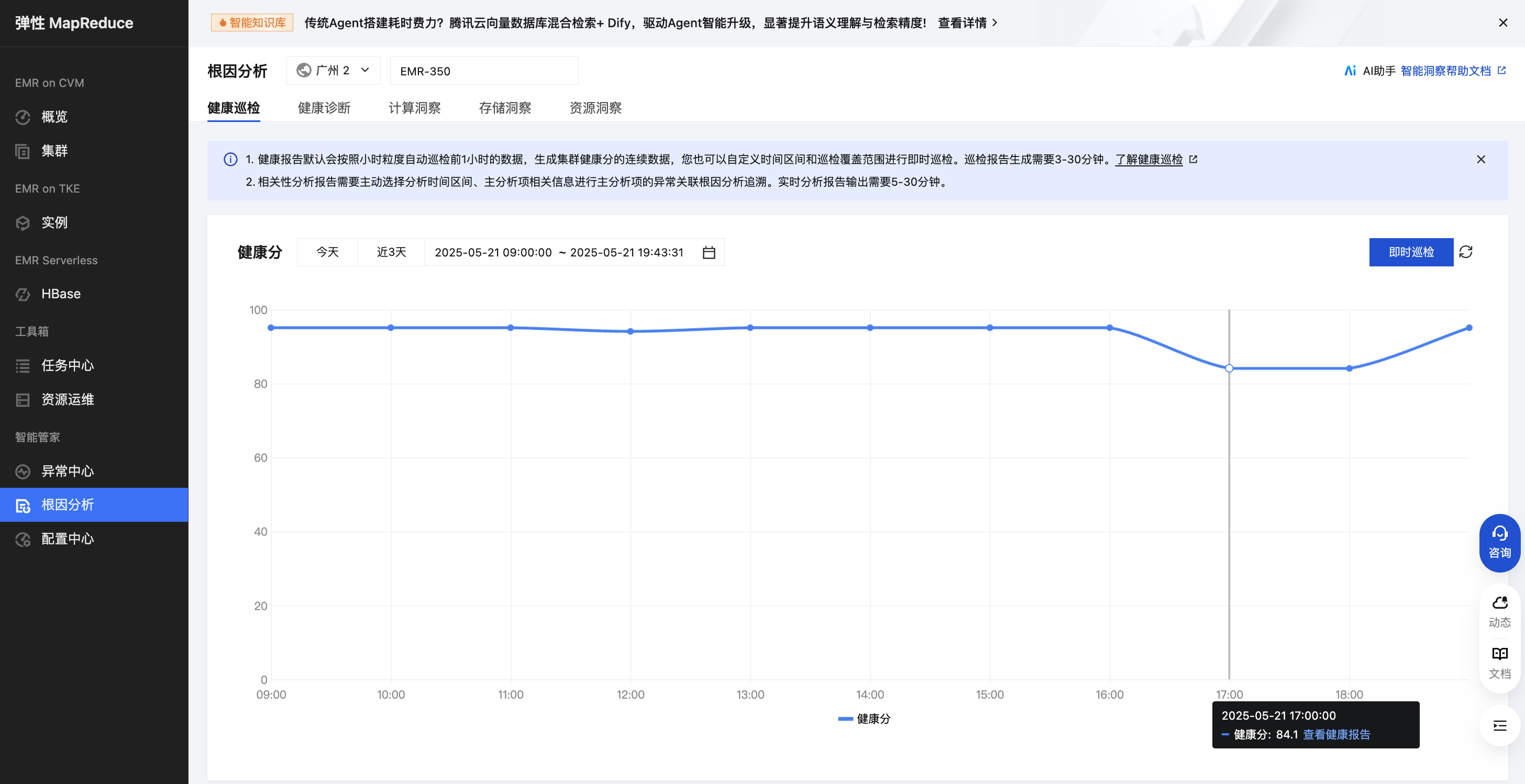 1. 健康报告默认会按照小时粒度自动巡检前1小时的数据,生成集群健康分的连续数据,您也可以自定义时间区间和巡检覆盖范围进行即时巡检。巡检报告生成需要3-30分钟。