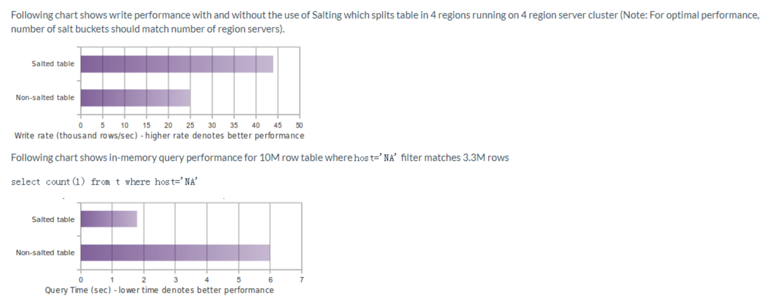 可以免除使用 HBase API 时需要精心设计 RowKey 的麻烦。如果用户对 HBase Row Key 的设计理解不够,建议使用 salted 表。Phoenix 官方提供的写和查询,salted 表和非 salted 表性能对比:
