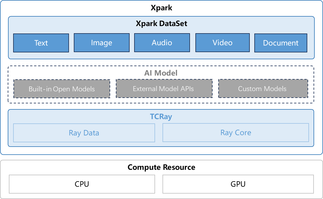Xpark DataSet 基于 Ray 的 Data 模块扩展,内置文本、图片、音频、视频等多模态数据处理算子以及常见数据处理 Pipeline。DataSet 中部分算子基于 AI Model 实现,支持调用兼容 OpenAI 协议的内置开源模型、外部模型 API 或用户自定义模型处理数据。