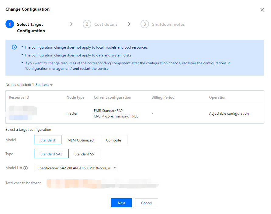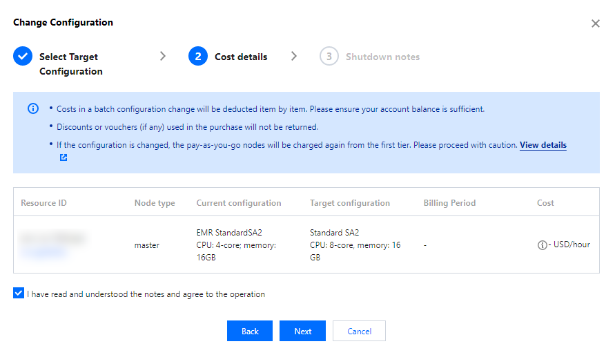3. On the configuration adjustment page, confirm the relevant change information. It is crucial to read the important prompts carefully and check the box to agree to the change information.