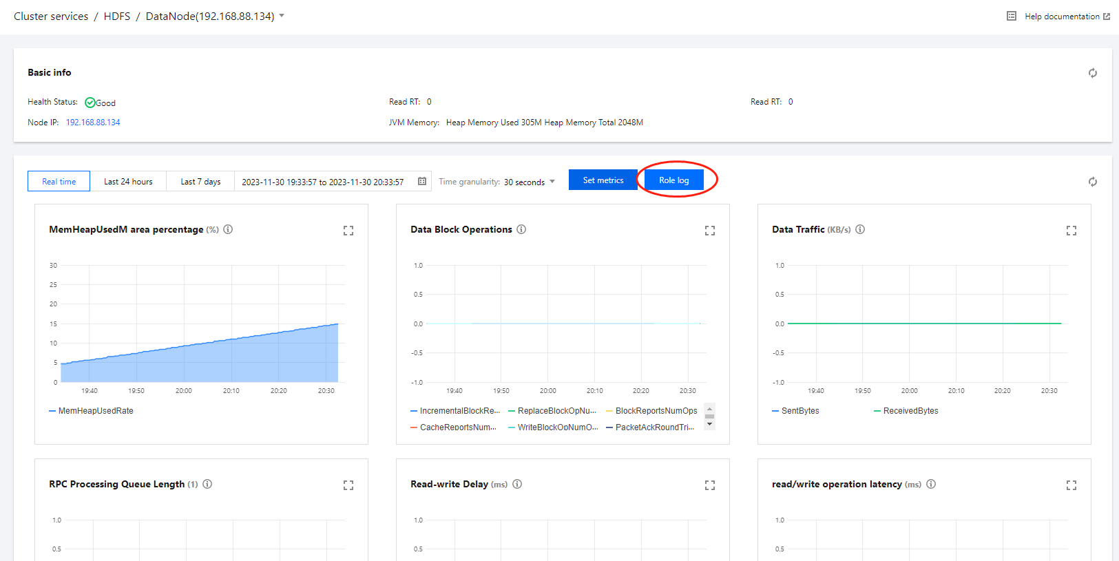 或者在集群详情页中选择集群服务>组件卡片>角色管理,查看角色列表,选择某一节点 IP 单击跳转,进入节点监控指标展示页,单击角色日志,可跳转日志搜索页面。