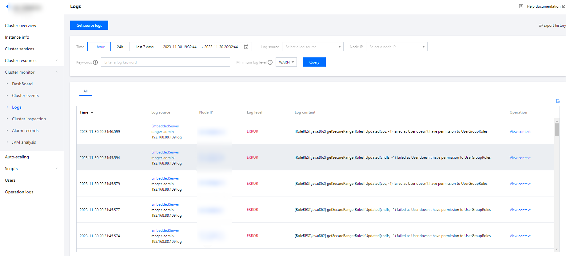 2. 在集群详情页中选择集群监控 > 日志可根据当前集群、日志文件、节点 IP 和时间范围条件过滤,查看日志内容。