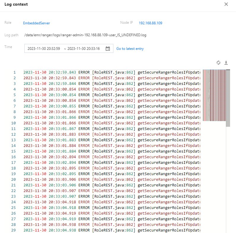 Ranger | EmbeddedServer | /data/emr/ranger/logs/ranger-admin.log | EmbeddedServer 的运行时日志 |