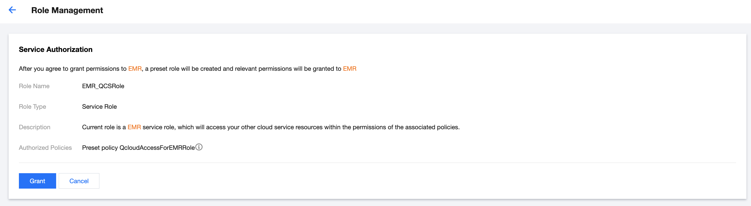 For more granular authorization, you can set a custom service role for accessing cloud resources during big data job execution. The custom service role type is "Tencent Cloud Product Service", with "Elastic MapReduce" as the supported role service.