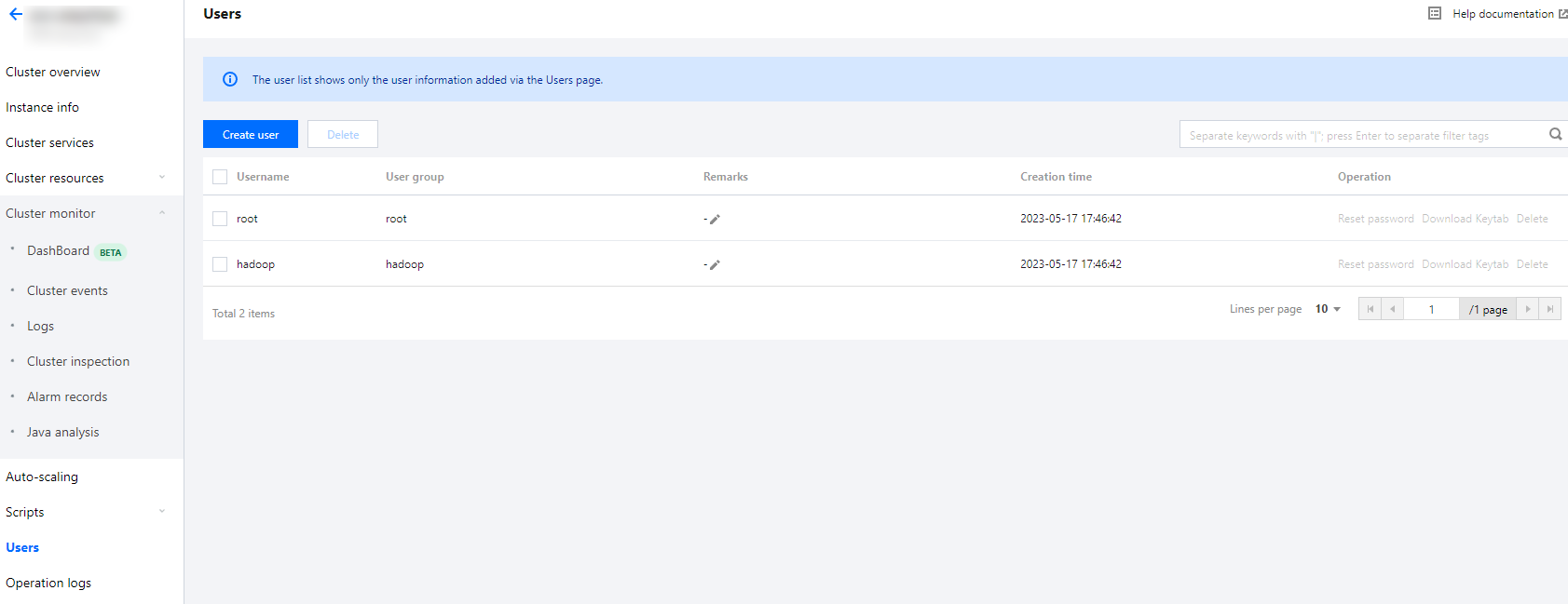 2. On the cluster details page, click on User Management. This page supports functions such as batch user addition, batch user deletion, password reset, and Keytab download.