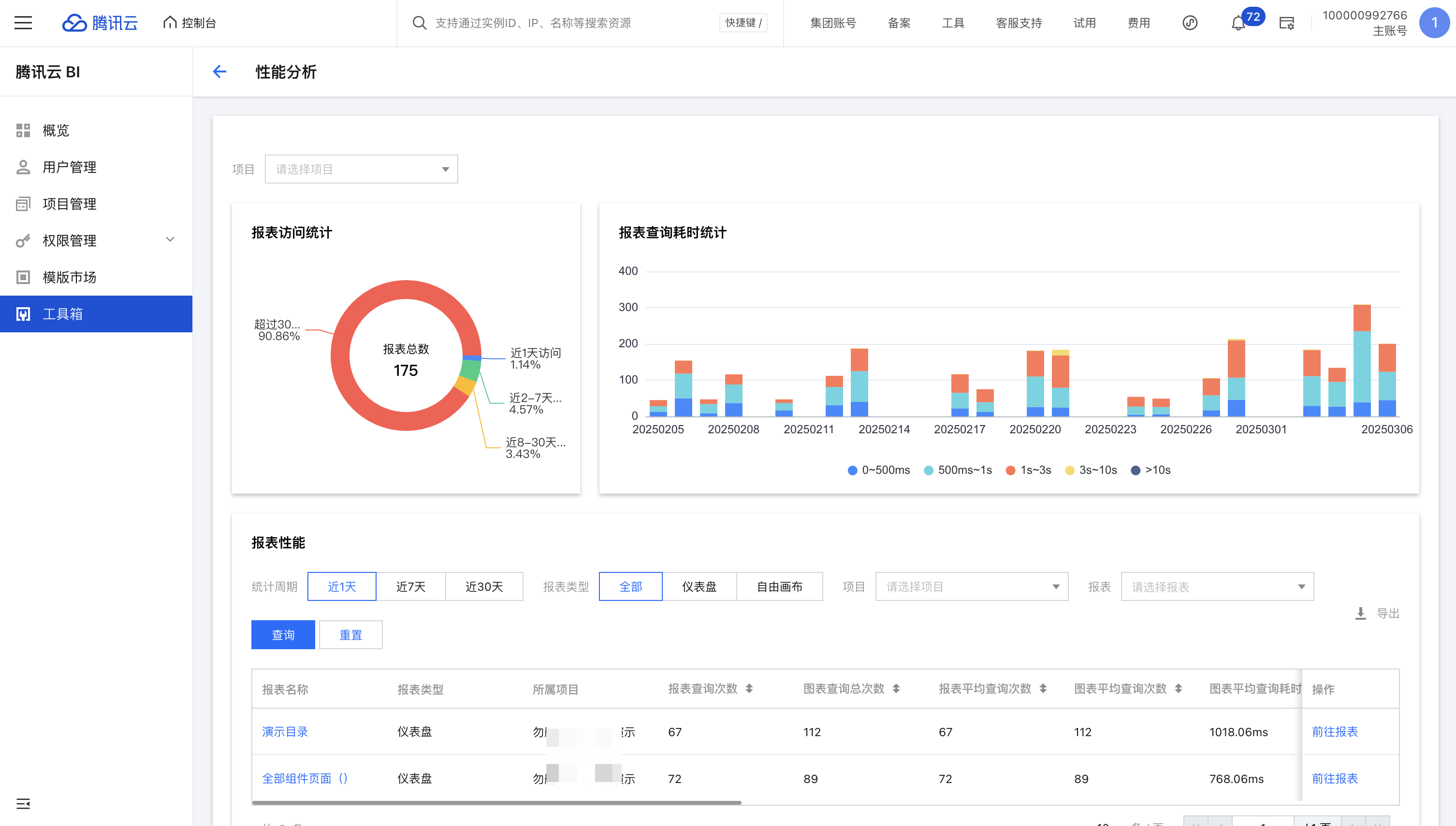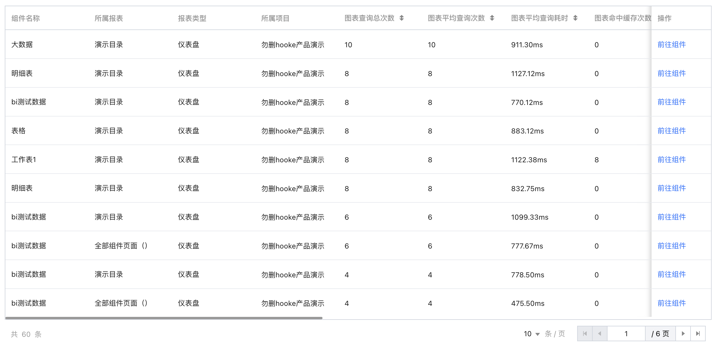 报表制作完成后,用户进行访问,BI 提供性能分析能力,帮助了解报表的查询耗时、图表的查询次数、耗时等情况。
