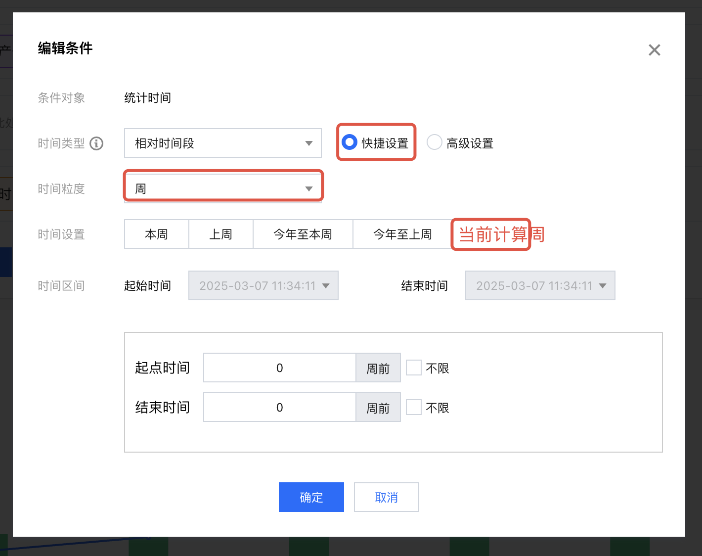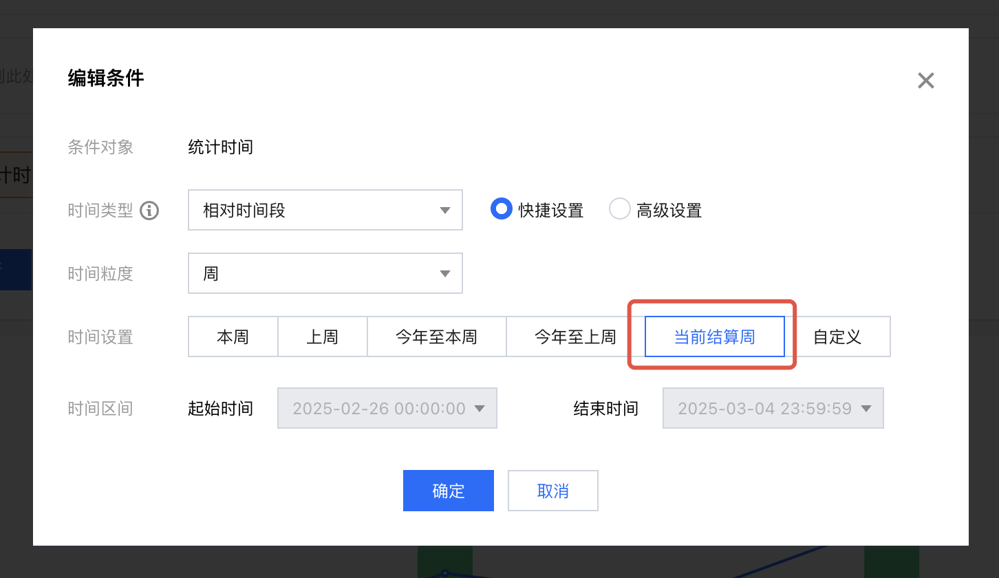 在分析条件字段过滤时,可在“周”颗粒度下,可见“当前结算周”: