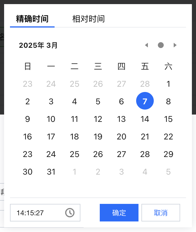 整个时间配置面板,包含精确时间和相对时间,其中精确时间通过日历选择一个固定时间;而相对时间可以进行复杂的时间配置。