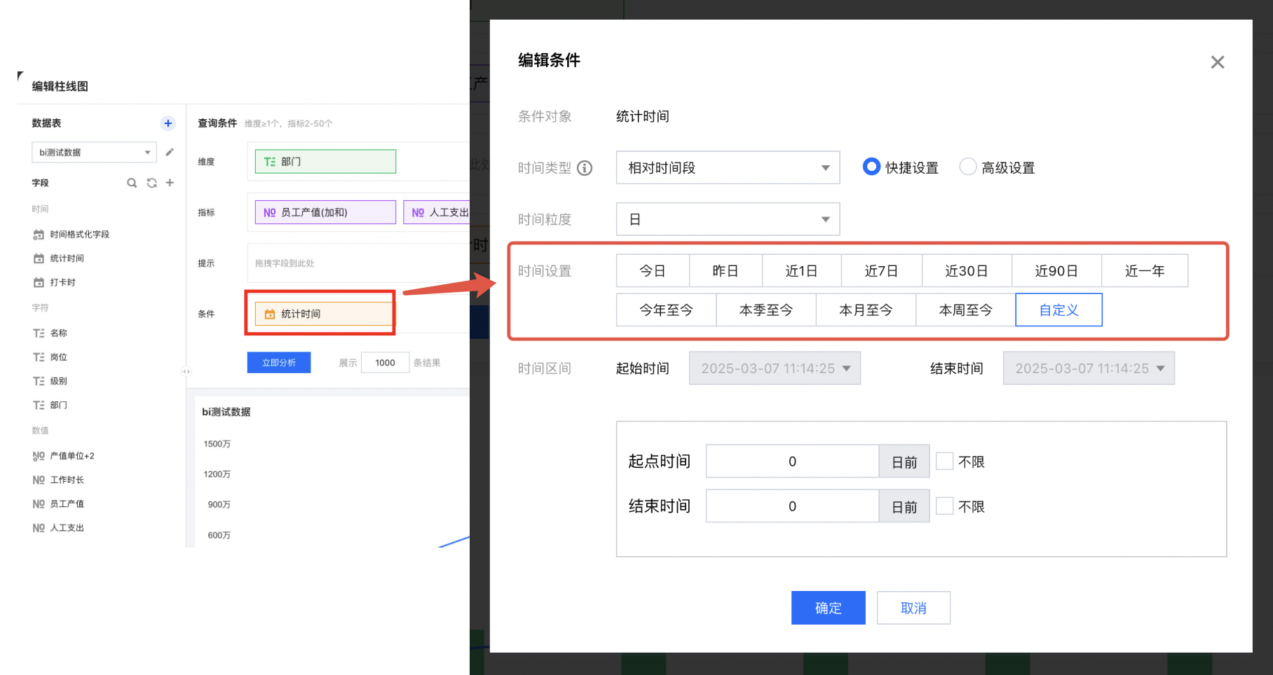 在实际场景中,存在需要定义近N天(相对时间)、某年某月某日(绝对时间)、本财年(绝对时间+相对时间)需求,通过常用时间设置,可以灵活定义时间描述。