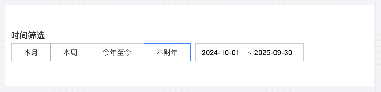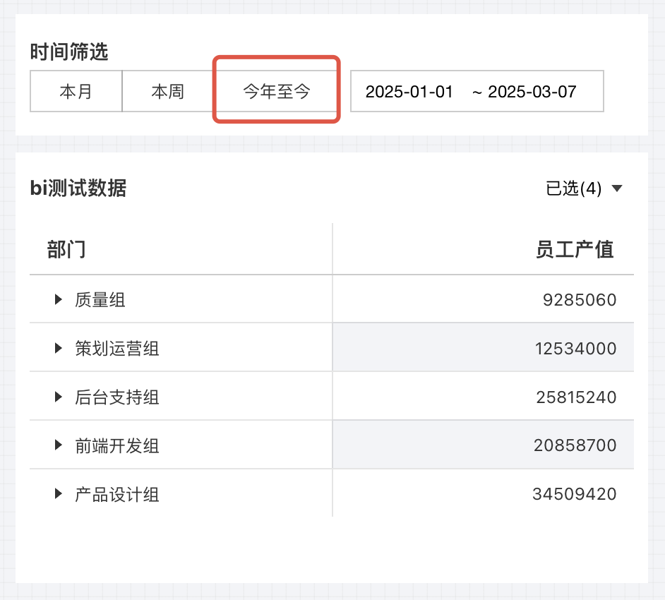 在使用时间筛选器时,用户可以使用快捷时间来快速选择时间,如下图,可快速选择 YTD(今年至今)时间。