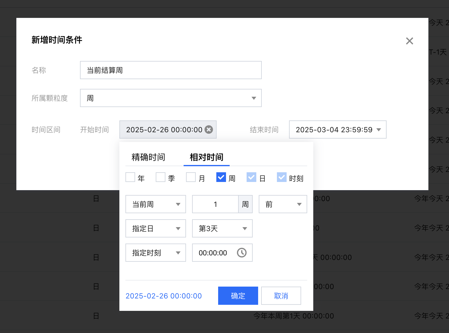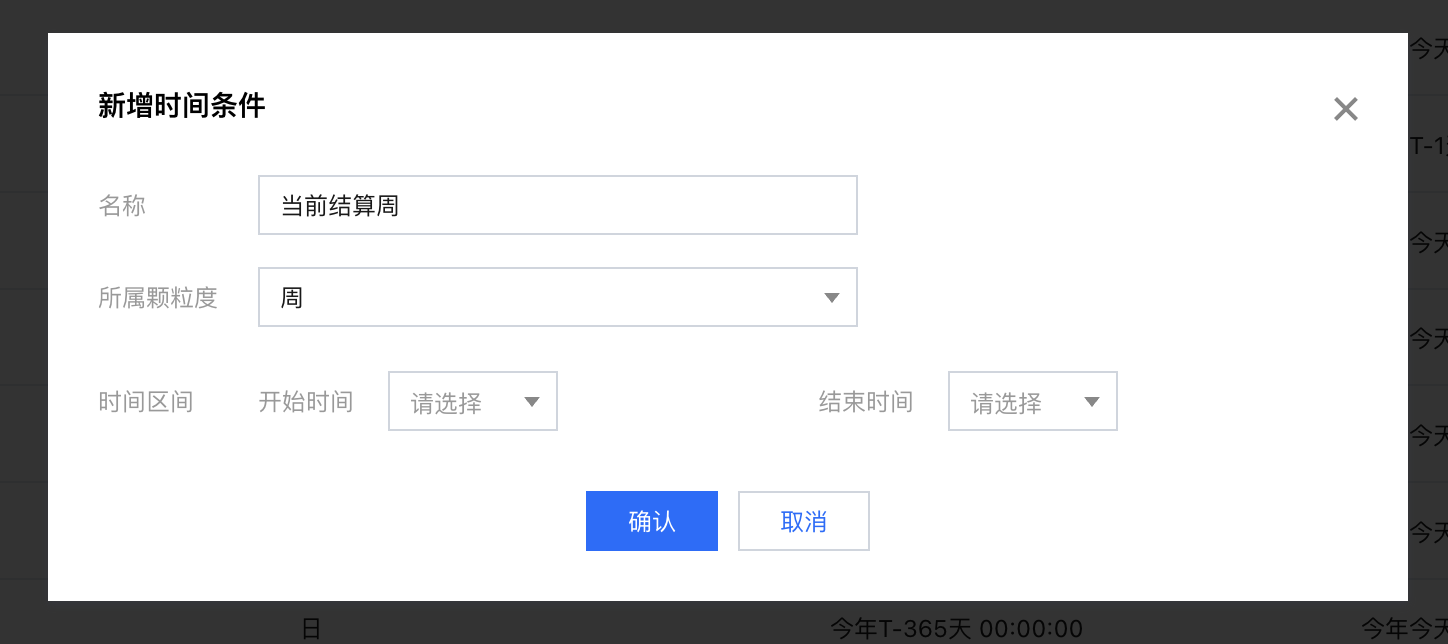 下面,我们从添加一个“当前结算周”来说明如何设置时间(假定结算周 = 上周三到本周二)。