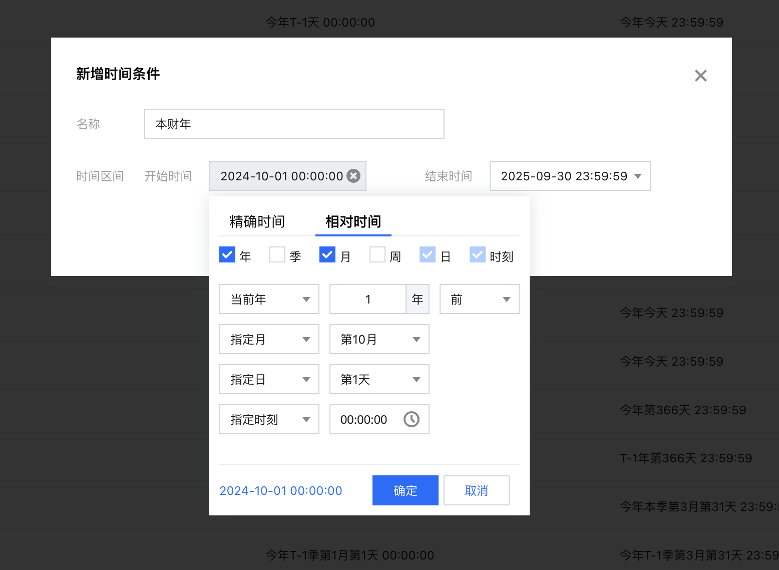 财报年(当年10月开始新一财年) | 开始时间:当前年1年前 + 指定月第10月 + 第1日 + 指定时刻 00:00:00 结束时间:当前年0年前 + 指定月第9月 + 指定日第30日 + 指定时刻 23:59:59 |