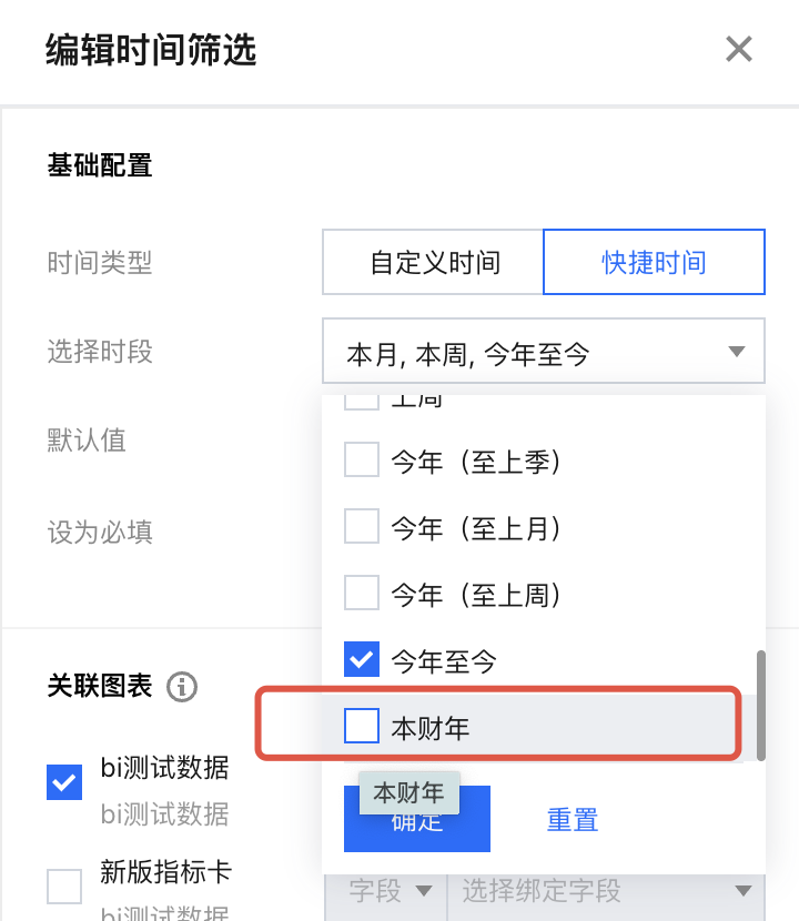 1. 进入 BI 控制台 > 工具箱 > 常用时间管理 > 筛选器常用时间,单击“新增”增加一个“本财年”时间: