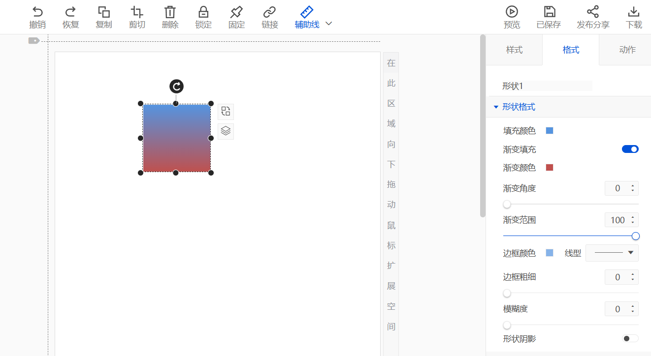 填充颜色,渐变填充颜色,边框颜色、线型、粗细,模糊度,圆角度,形状阴影。