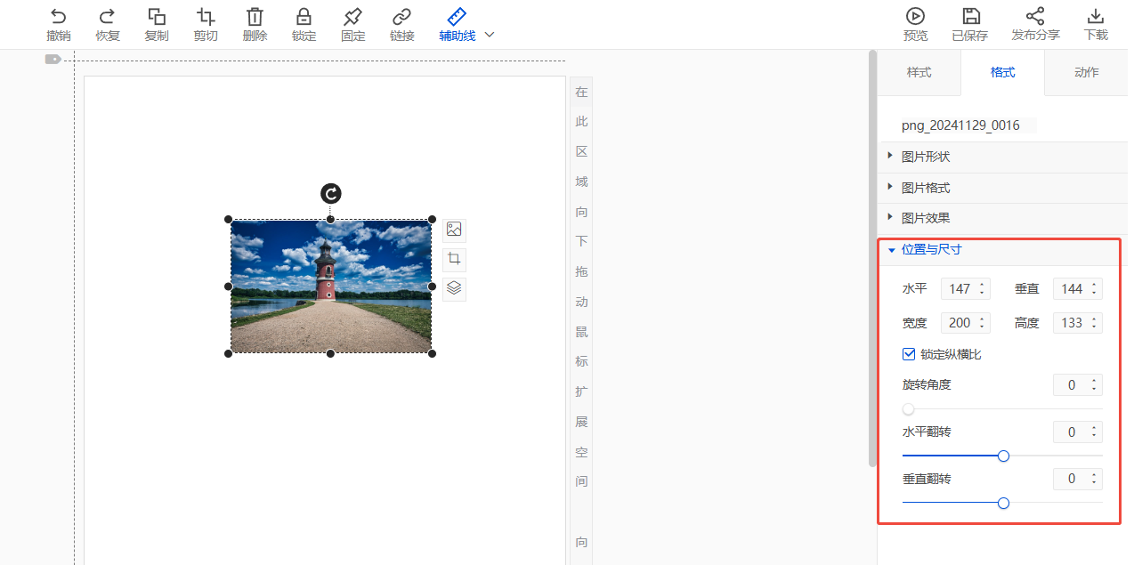 水平位置,垂直位置,宽度大小,高度大小,锁定纵横比,旋转角度,水平翻转,垂直翻转。