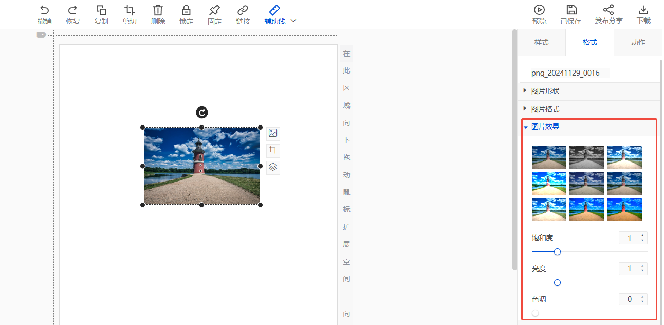 在图片格式功能区单击图片效果,可以进行设置:选择图片效果,饱和度,亮度,色调。