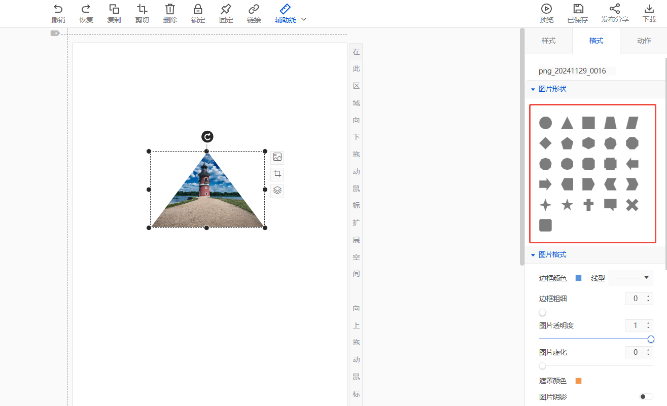 边框颜色、线型、粗细,透明度,图片虚化,遮罩颜色,阴影效果。