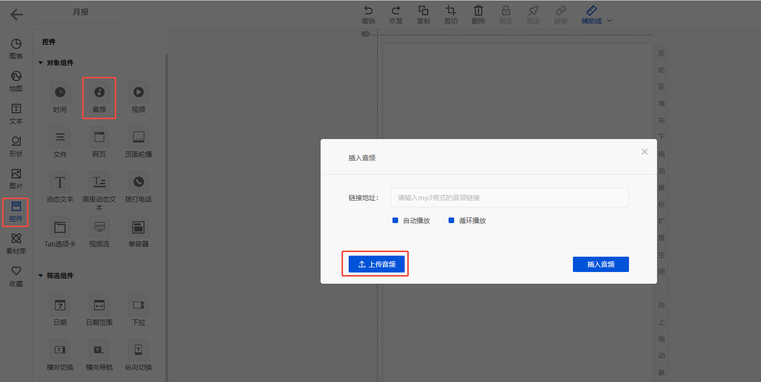 根据业务场景可以在简报或大屏中插入一些音频,使得整个版面内容更加丰富,表达更加全面。