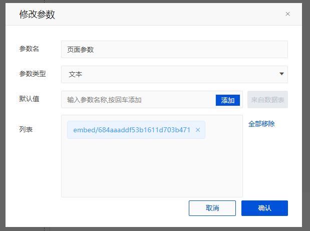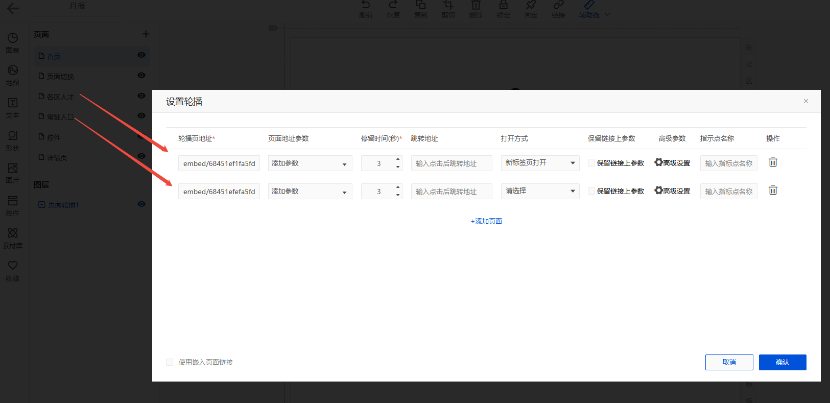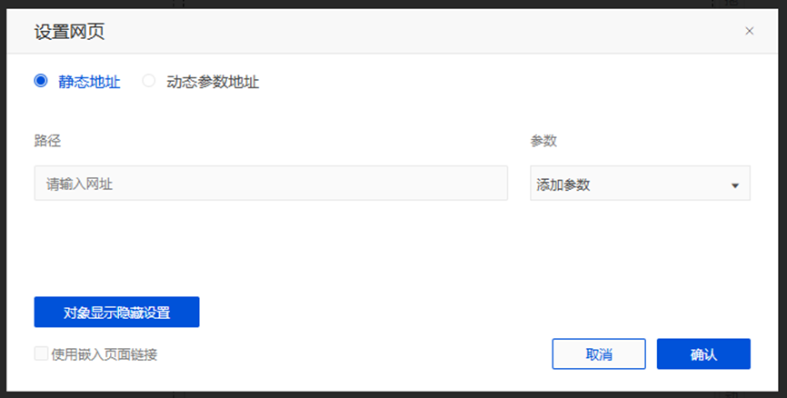 选择画布上网页组件 > 选择右上角编辑数据 > 静态地址 > 路径中输入目标嵌入网址(可以是外部网址,也可为本平台页面嵌入链接网址)> 如若需要参数控制网页内容,可以添加对应参数,如若不用直接单击确认。